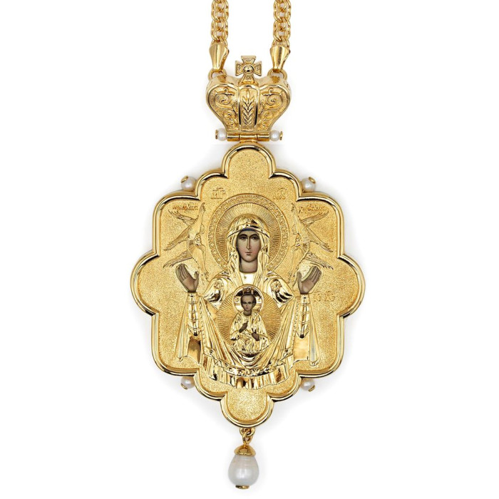 Archiepiscopal Engolpion made of gold-plated brass, complete with a gold-plated chain, decorated with river pearls - manufactured by Agat Jewellery according to all the canons of the Orthodox Church.