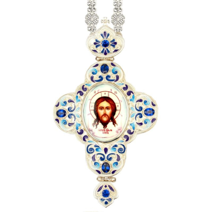 Pectoral cross for a priest made of silver-plated jewelry alloy, decorated with cubic zirconia and jewelry enamel, with a silver-plated chain - manufactured by Agat Jewellery according to all the canons of the Orthodox Church.