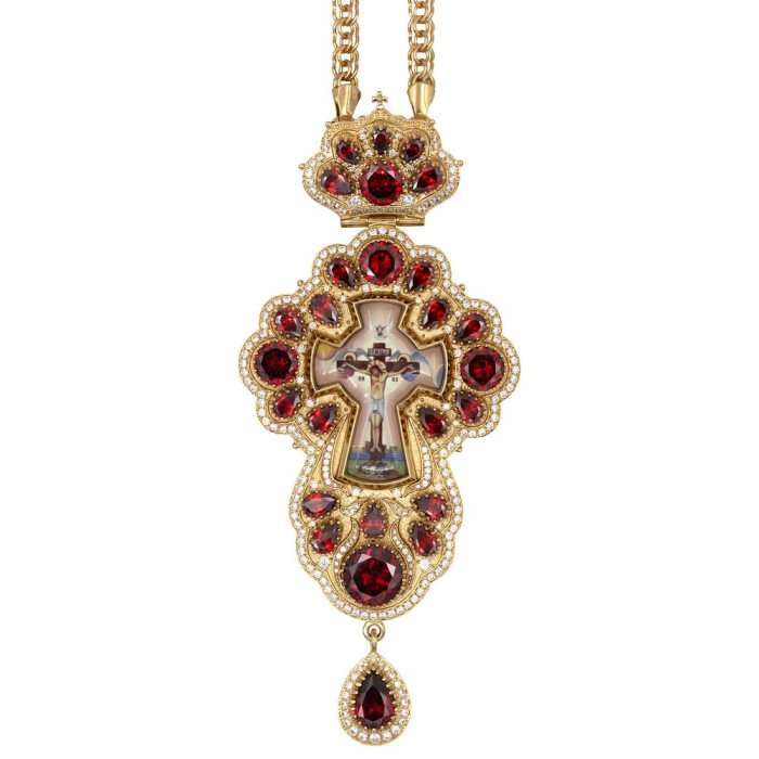 Priest's pectoral cross made of brass-based jewellery alloy with gold plating, decorated with cubic zirconia inserts, complete with a gold-plated chain - manufactured by Agat Jewellery according to all the canons of the Orthodox Church.