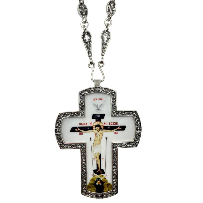 Cross for priest in brass in silver plating with niello and chain (BJ0490LR-2+80LR) - manufactured by Agat Jewellery according to all the canons of the Orthodox Church.
