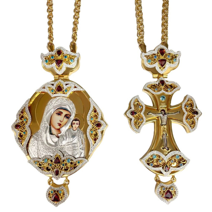 Arcibiskupský pektorál vyrobený ze zlacené šperkařské slitiny s částečným postříbřením, zdobený vložkami z kubické zirkonie, doplněný pozlacenými řetízky.