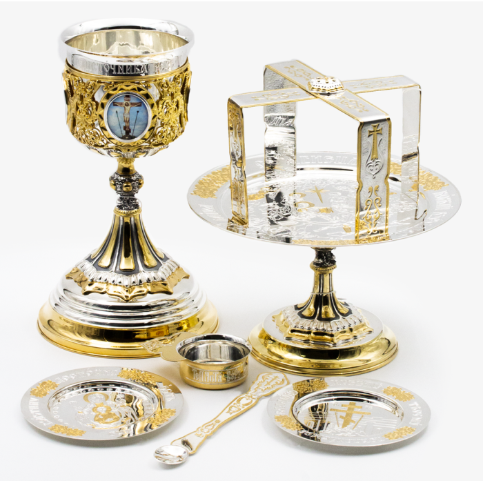Eucharistické sada vyrobená z mosazi a postříbřena (BG0980KLFR-SET+7) - vyrobeno společností Agat Jewellery v souladu se všemi kánony pravoslavné církve.