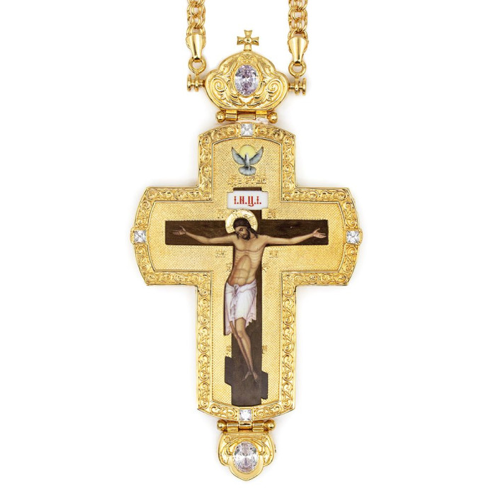 Kříž pro kněze z mosazi ve zlaceném provedení s bižuterií a řetízkem (BJ0438LP-2+1LP) - vyrobeno společností Agat Jewellery v souladu se všemi kánony pravoslavné církve.