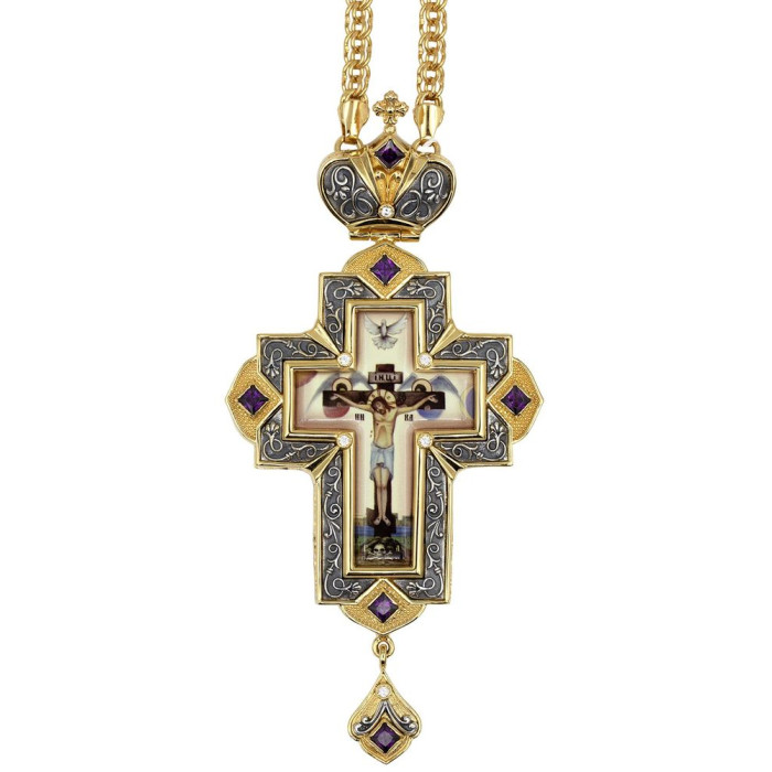 Kříž na prsa pro kněze, vyrobený ze zlacené šperkařské slitiny s částečným postříbřením a zlaceným řetízkem, zdobený kubickými zirkony a dekorativním černěním.