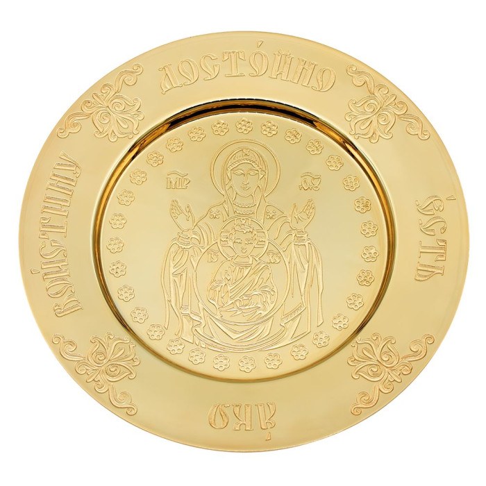 Mosazný pozlacený talíř s obrazem Panny Marie Znamení - vyrobeno společností Agat Jewellery v souladu se všemi kánony pravoslavné církve.